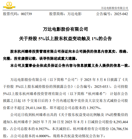 万达电影(002739)8月5日发布公告称,公司持股5%以上股东杭州臻希投资管理有限公司(以下简称“杭州臻希”)于2025年7月30日至8月1日期间,通过大宗交易方式累计减持公司股份829.35万股,占公司总股本的0.3927%。此次减持后,杭州臻希持有公司股份降至1.267亿股,持股比例相应由6.3927%减少至6.0000%。