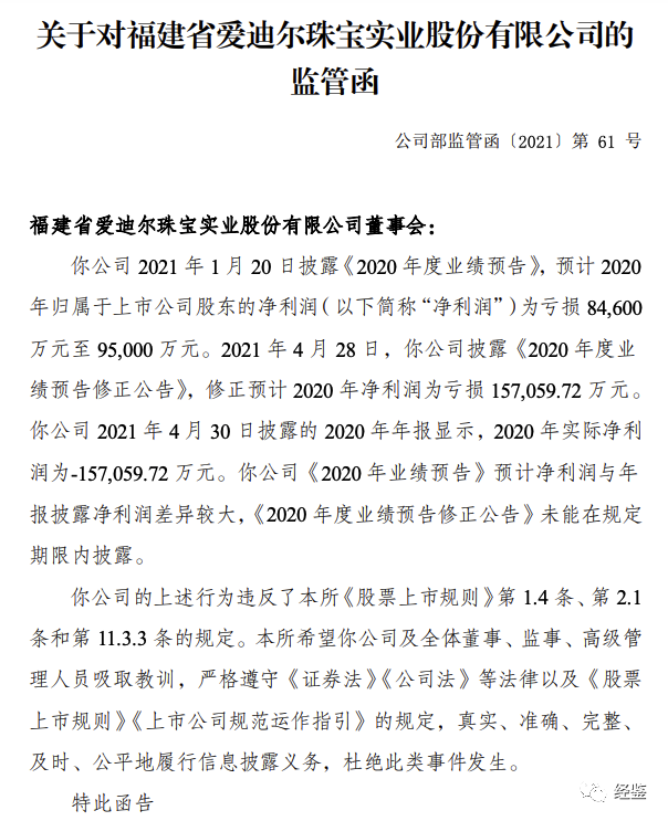 6月16日,深交所再次向爱迪尔下发监管函,监管函称,爱迪尔《2020年业绩预告》预计净利润与年报披露净利润差异较大,《2020年度业绩预告修正公告》未能在规定期限内披露。