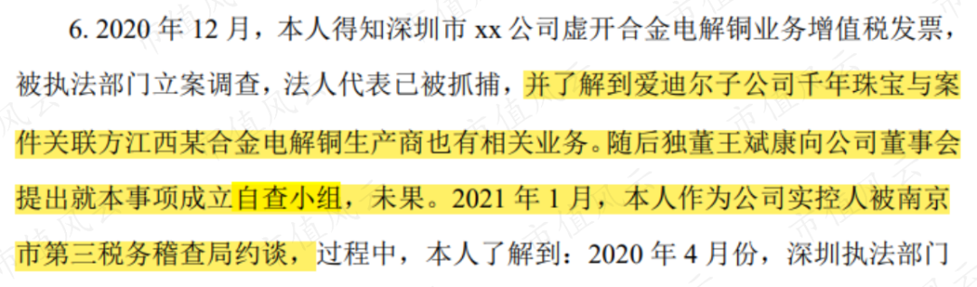 回到开头提到的千年珠宝虚开发票的事件,早在2020年12月,苏老板称就已经了解到,千年珠宝似乎存在虚开发票的情况。随后,独董王斌康向董事会提出成立自查小组,但未果。