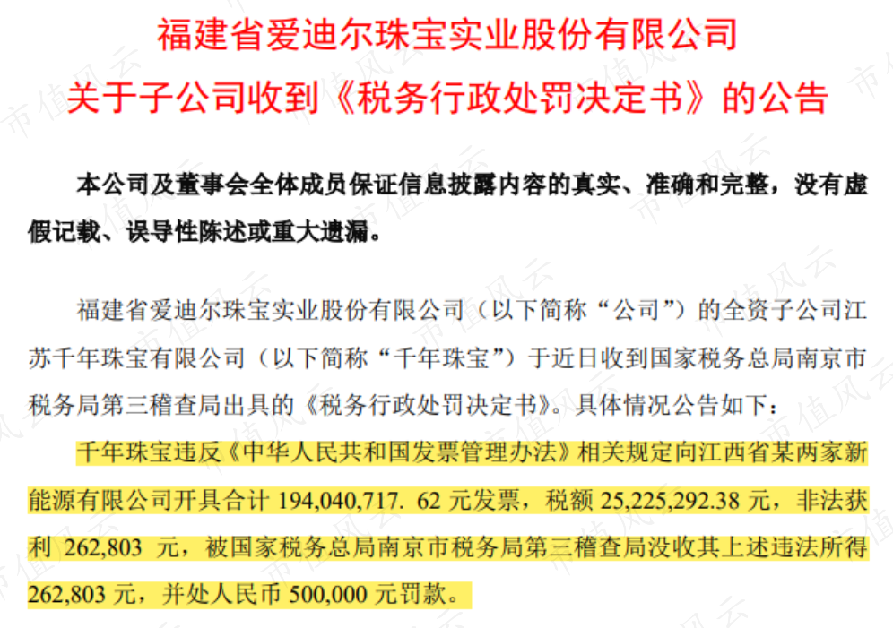 2月8日,爱迪尔(002740.SZ)公告,子公司千年珠宝因违反规定,向江西省某两家新能源公司开具发票1.94亿,而收到了《税务行政处罚决定书》。同时,南京市税务局第三稽查局没收其违法所得26万元,并处以50万元罚款。