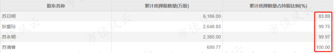 截至目前,苏老板的股票累计质押率为84%,其一致行动人狄爱玲、苏永明、苏清香等人的股票质押率近乎为100%。