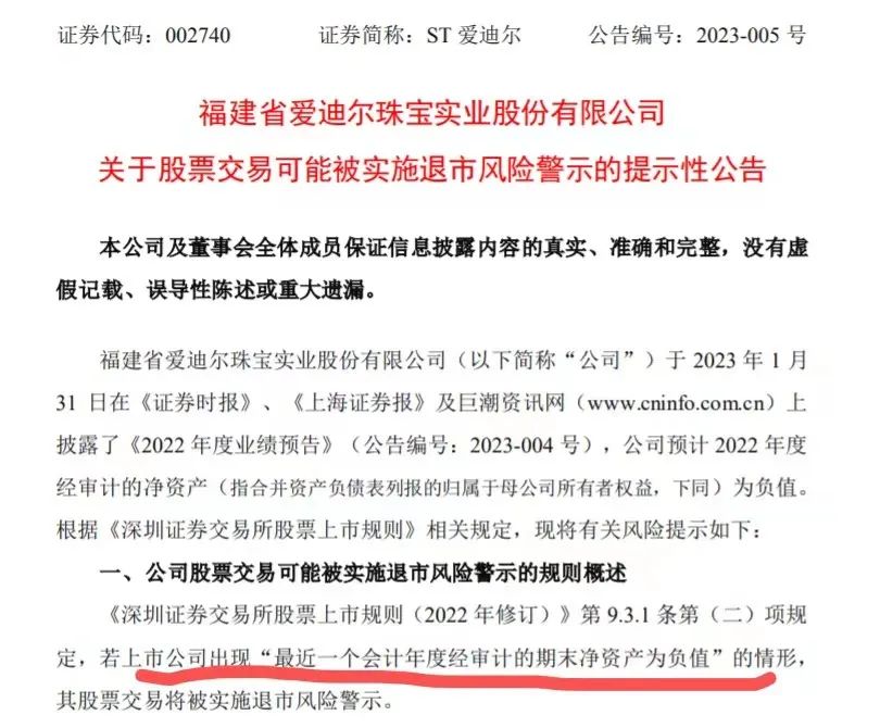 1: ST爱迪尔2022年报后净资产负,触及深交所《上市规则》9.3.1第二项。