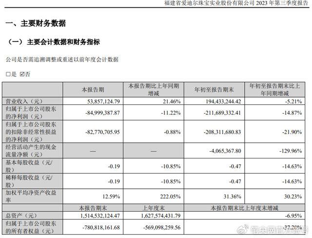 *ST爱迪发布的2023年三季报显示,今年前三季度,该公司实现营业收入1.94亿元,同比下降5.21%,归属于上市公司股东的净利润-2.12亿元,同比下降14.87%。