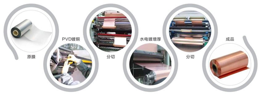 PET复合铜箔生产工艺基本原理,是采用真空沉积的方式将PET金属化,然后采用水电镀的方式加厚铜层。在PET复合铜箔的水电镀环节,由于 PET 表面光滑的特性,增强铜层与PET薄膜结合力,以及使得采用水电镀加厚的铜层具有均匀性和平整性,是其技术难点。
