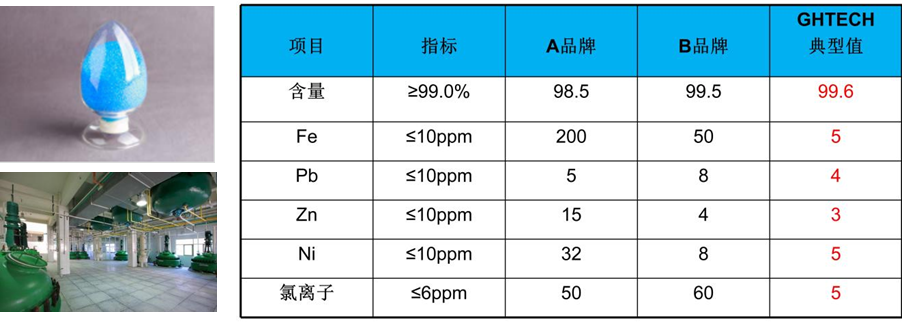 光华科技的硫酸铜纯度高,杂质含量极低,不含有机杂质。通过实测数据,A为日本某知名品牌,B为国内某知名品牌。GHTECH光华科技的产品质量优于A、B品牌。