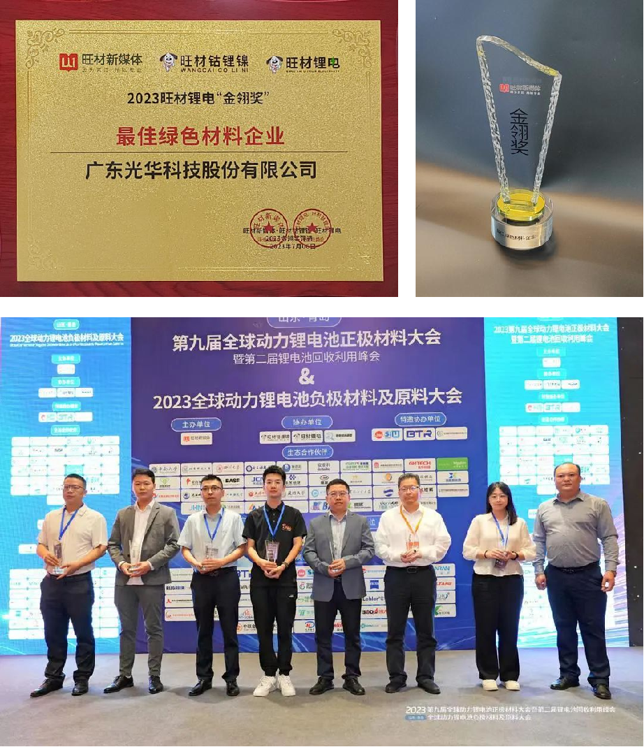 近日,备受业界瞩目的2023第九届全球动力锂电池正极材料大会暨第二届锂电池回收利用峰会在山东青岛隆重举行。作为电池材料领域致力于打造锂电池循环产业一体化的创新型企业,GHTECH光华科技凭借着领先的技术创新优势和绿色低碳发展成效,荣获2023年度动力锂电池回收利用“金翎奖”最佳绿色材料企业称号,彰显了公司在电池材料领域的影响力和竞争力,也是业界对光华科技推动电池产业可持续发展的肯定。同时,光华科技受邀发表题为《碳中和下的电池循环产业使命与愿景》的主旨演讲,引起与会者的广泛共鸣。