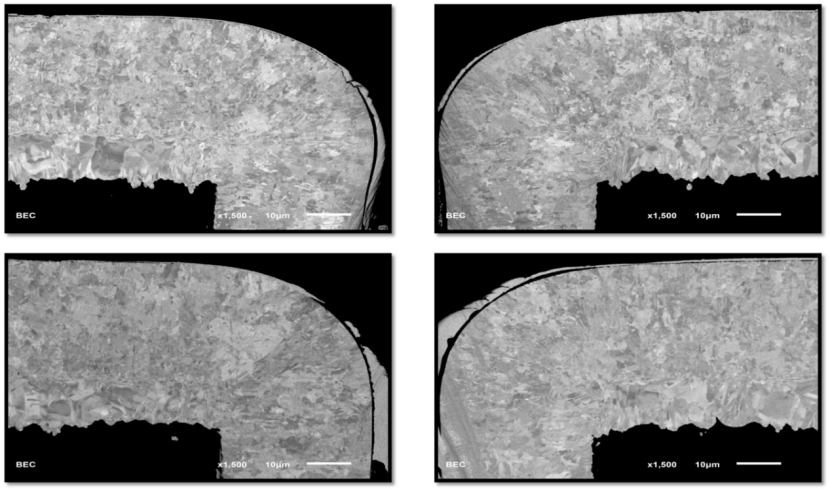 离子切割的镀层形貌,在SEM下可见,不同晶面排布致密,无柱状结晶界面和颗粒粗大的晶型。