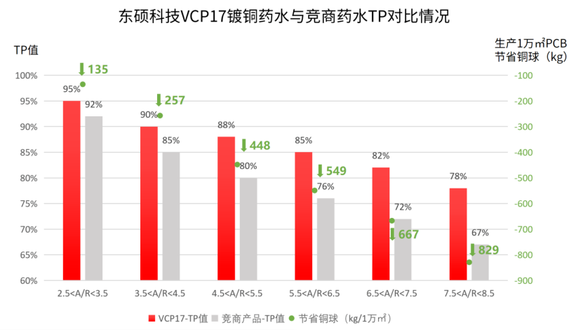 深镀能力提高,是指消耗相同的铜,更多的铜被镀在孔内,板面上镀的铜就会相对减少,孔内镀的铜厚和板面铜镀的铜厚就会比较接近,使得孔内与板面上的铜的比增加,从而使孔中铜厚达到客户要求,又可以不增加成本,所以提高深镀能力可以有效减少铜消耗量。VCP17药水镀铜药水能节省铜球成本(针对AR:5:1以上的板件,铜球用量每平米节省约2.5RMB),同时也节省生产中的电量与水处理等运营成本。