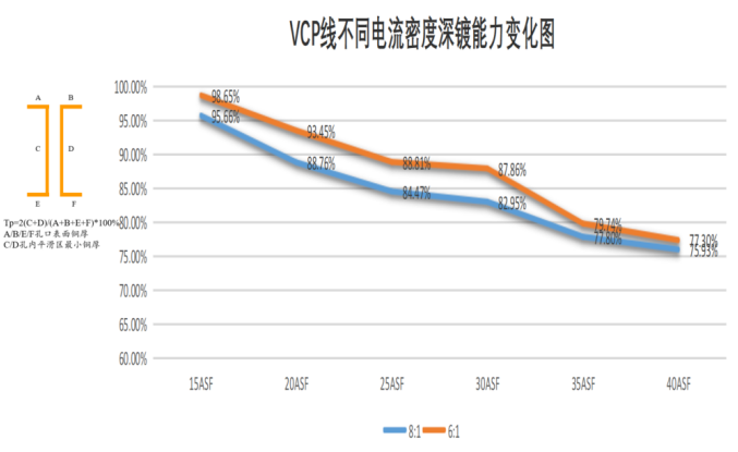 深镀能力(Throwing Power,TP)是评估PCB镀通孔效果的一个重要指标,通常指一定板厚和孔径条件下,电镀后孔内与孔口镀层厚度的比值,体现孔内铜镀层厚度的均匀性。深镀能力的提升,对提高PCB可靠性和生产效率,降低制造成本具有非常重要的作用。