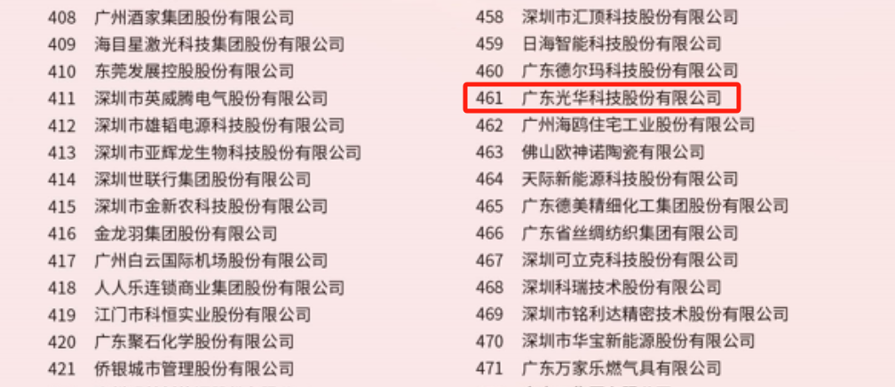 2023年10月25日,由广东省企业联合会、广东省企业家协会主办的2023广东500强企业发展大会在广州举行。大会以“强化龙头引领,推动产业升级”为主题,会上隆重公布了“2023广东企业500强”榜单。作为先进的专用化学品制造与新能源循环利用技术综合服务商,光华科技再度荣登广东企业500强榜单。