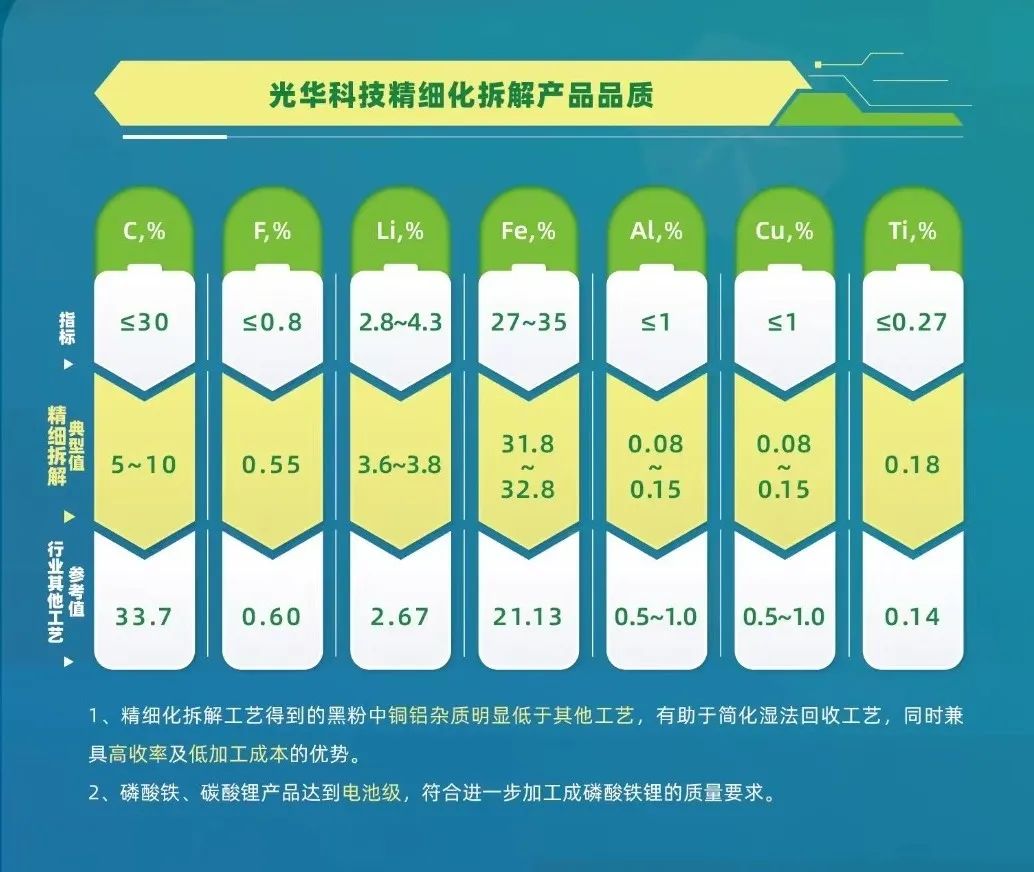 公司目前已具备4万吨/年废旧动力电池的精细化拆解能力,为母公司光华科技的电池再生利用生产线提供原材料,形成电池回收利用产业闭环。同时,本产品的规模化生产,将有效降低磷酸铁锂电池厂商的制造成本,有利于打破国外知名品牌的技术、品牌壁垒,推动我国磷酸铁锂电池行业乃至整个新能源产业的发展,推动新能源电池产业链上下游协同发展,助力中国新能源产业集群建设。