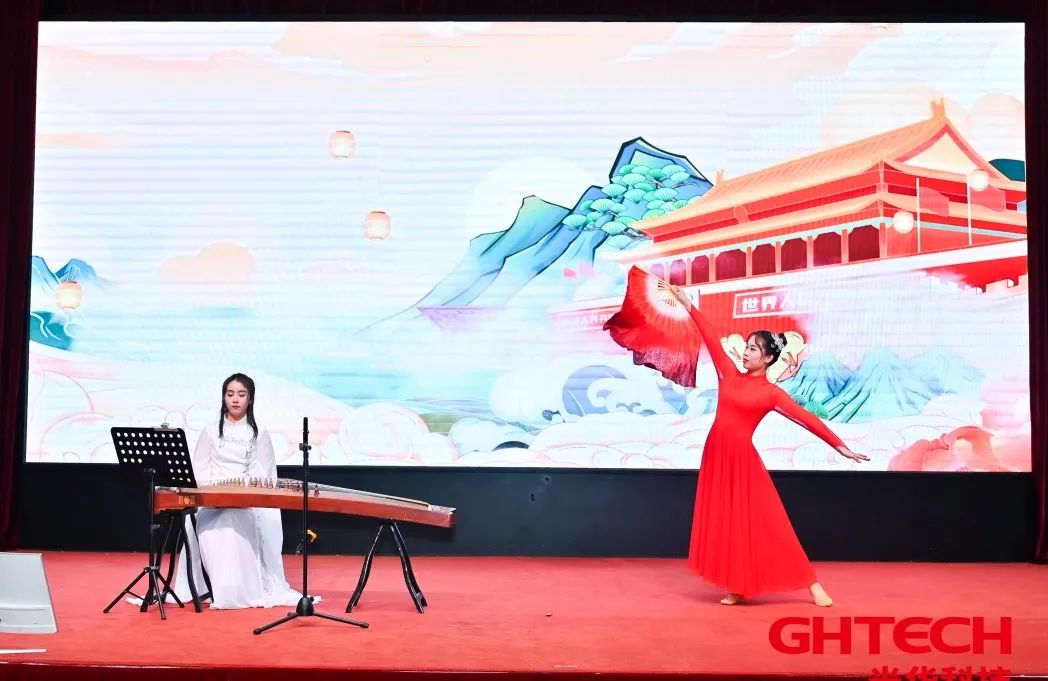 红日升在东方,其大道满霞光。光华人怀揣信仰,挺起脊梁欣赏了古筝演奏及舞蹈表演《万疆》