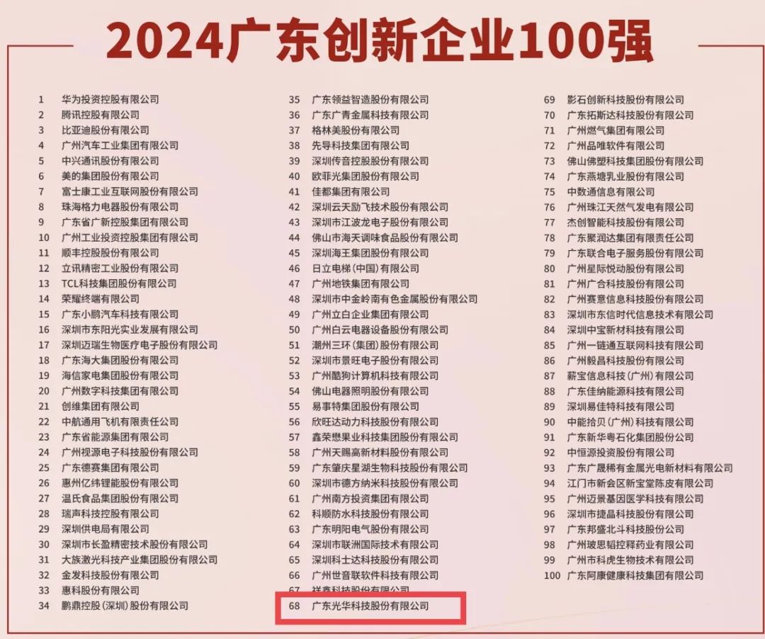 9月20日,广东省企业联合会、广东省企业家协会在广州召开2024广东500强企业发展大会,正式向社会发布了“2024广东企业500强”“广东创新企业100强”等榜单及其分析报告。GHTECH光华科技荣登“2024广东创新企业100强”,排名68位,其在精细专用化学品、电子信息产业、新能源电池材料三大领域创新研发实力获认可。