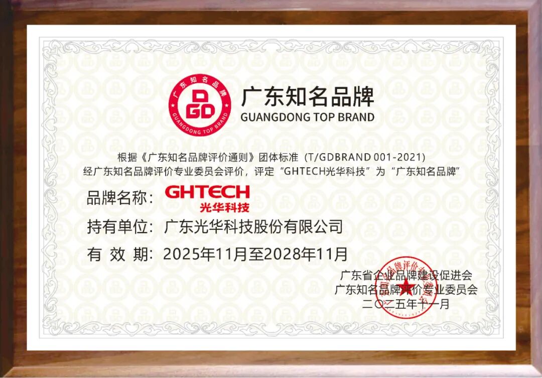 经广东知名品牌评价委员会召开现场及小组评审工作会议,对申请品牌进行了企业申报、资格审查、申报材料核查、实地抽查、行业知名度调研、公开查询、专家评审等一系列环节后,第十一批“广东知名品牌”名单揭晓。本次榜单汇聚了广东各领域的标杆企业,包括Transsion 传音、DONGPENG东鹏、555虎头电池等知名品牌。“GHTECH 光华科技 ”以领先的技术实力、完善的产品体系及优质的客户服务,荣获“广东知名品牌”,彰显了其卓越的品牌实力。