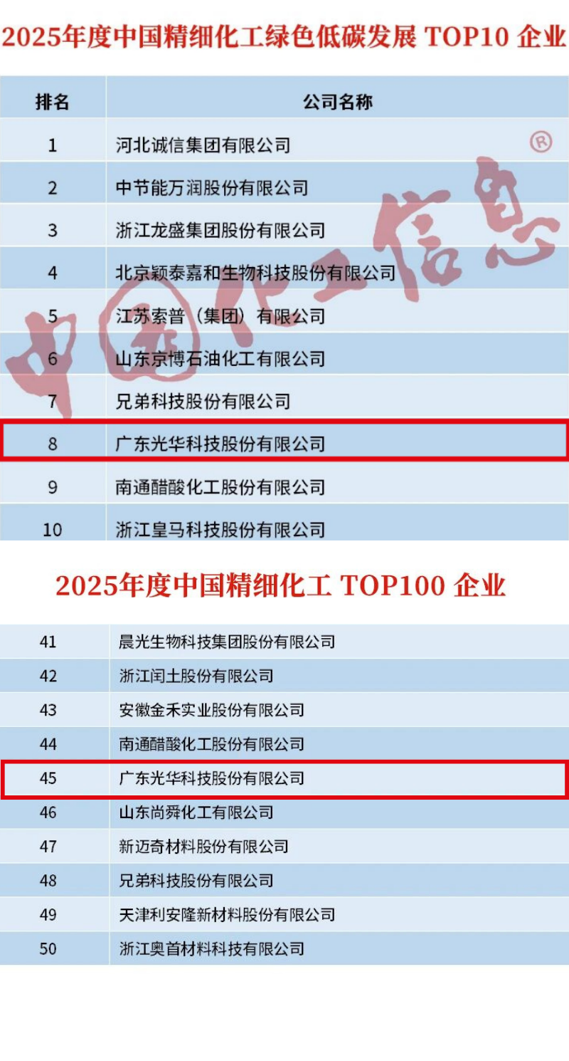12月4日,由 中国化工 信息中心、 中国化工 情报信息协会主办的第二十五届精细化工行业大会在宁夏举行。GHTECH 光华科技 凭借卓越的综合实力与可持续发展成果,蝉联“2025年度中国精细化工TOP100”,名列第45位,再进“绿色低碳发展TOP10”。