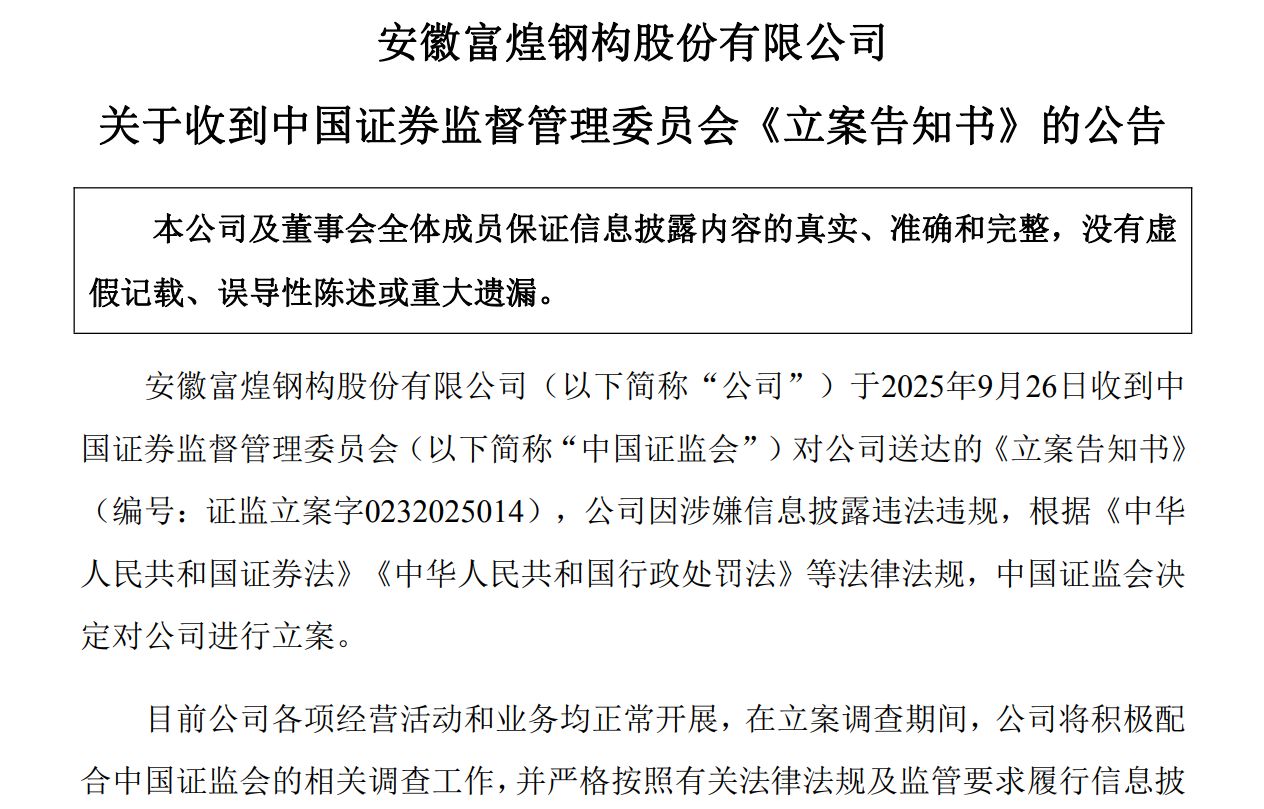 据富煌钢构9月26日公告,因公司涉嫌信息披露违法违规,根据《中华人民共和国证券法》《中华人民共和国行政处罚法》等法律法规,中国证监会决定对公司进行立案。
