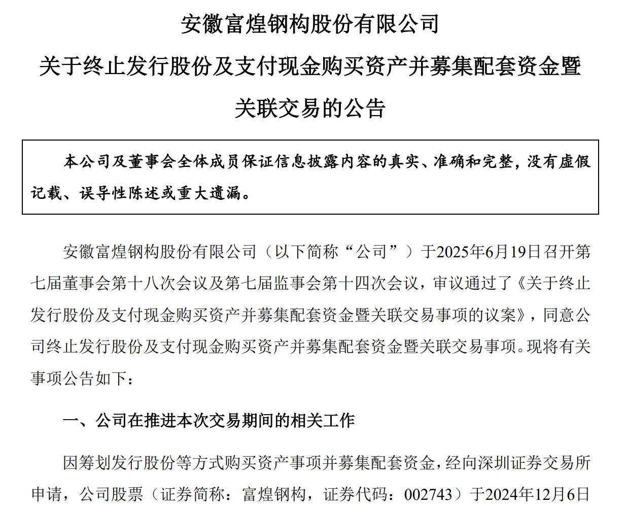 今年6月19日,富煌钢构公告称,其审议通过了《关于终止发行股份及支付现金购买资产并募集配套资金暨关联交易事项的议案》。