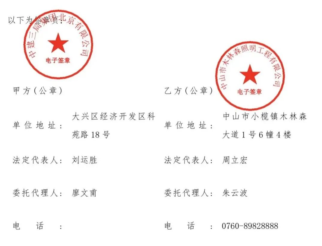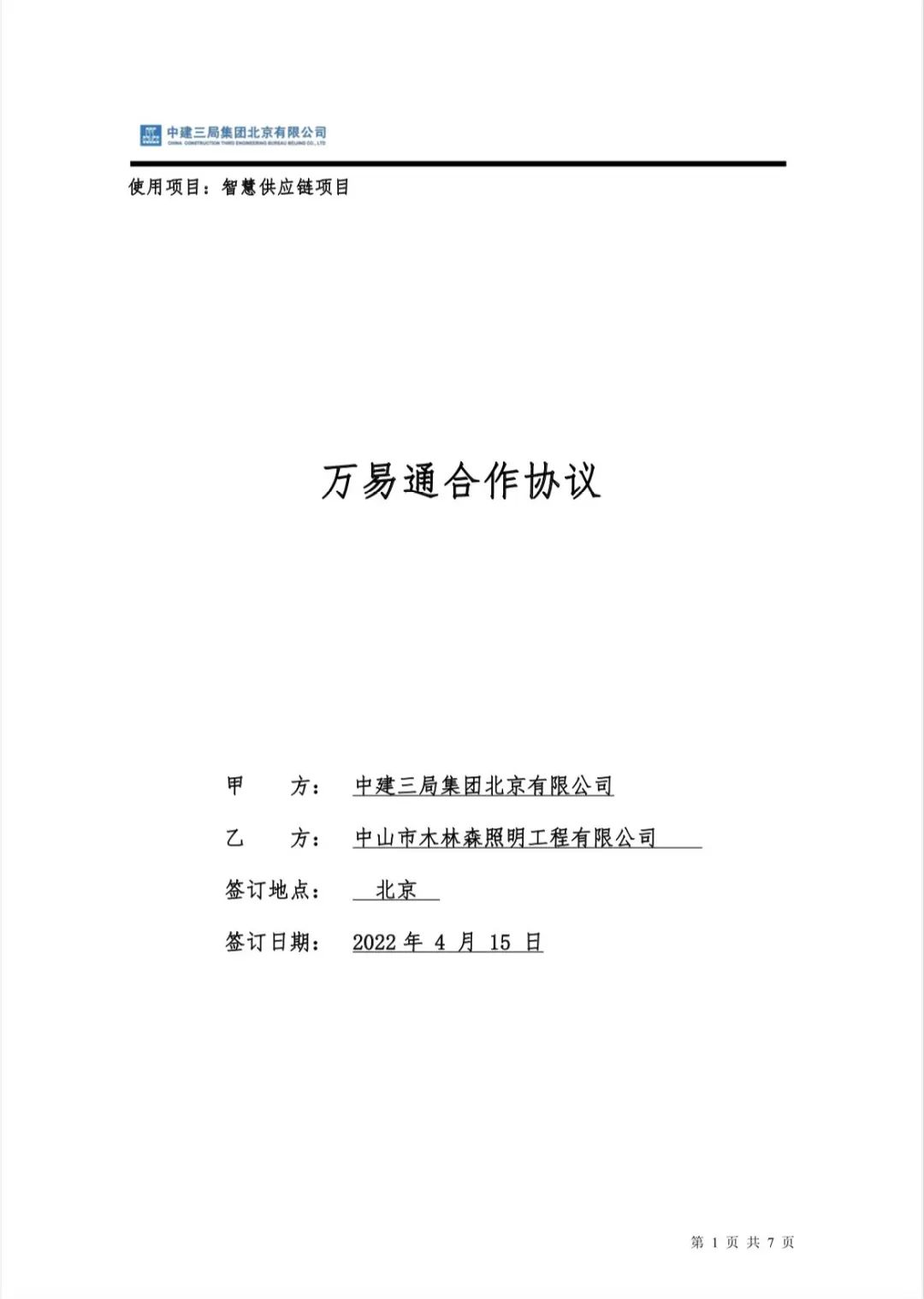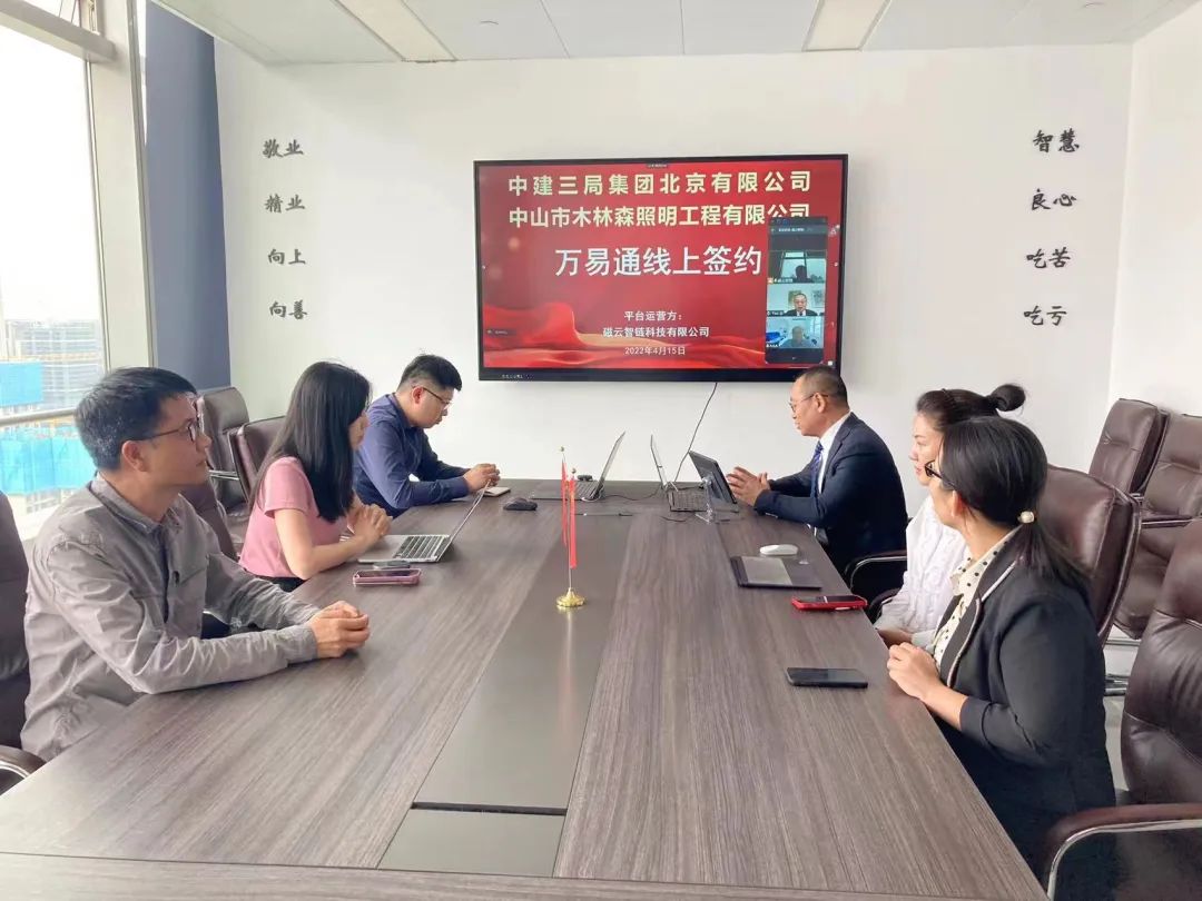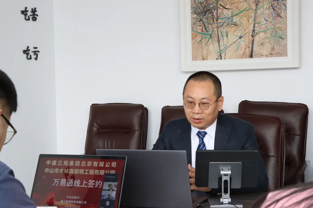 4月15日下午,中建三局集团北京有限公司与木林森股份有限公司(股票代码002745)旗下中山市木林森照明工程有限公司签订战略合作协议。中建三局智慧供应链平台采购负责人廖文甫,木林森股份有限公司董事长助理、木林森照明首席品牌官兼照明工程总经理朱云波代表双方参与本次战略合作签约会。
