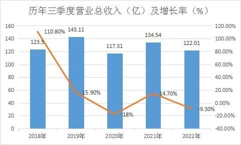 但在资本市场,一切以数字说话。从近五年木林森前三季度营业总收入来看,2018年、2019年、2020年、2021年、2022年前三季度营业总收入分别为123.5亿、143.11亿、117.31亿、134.54亿、122.01亿。