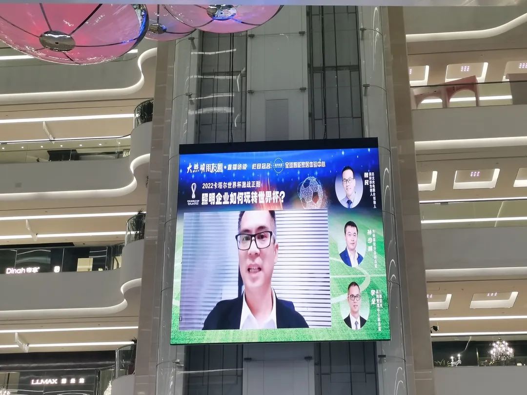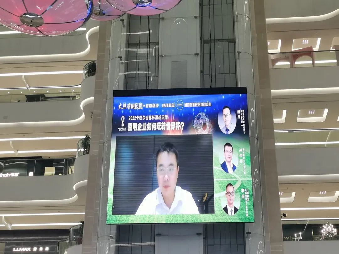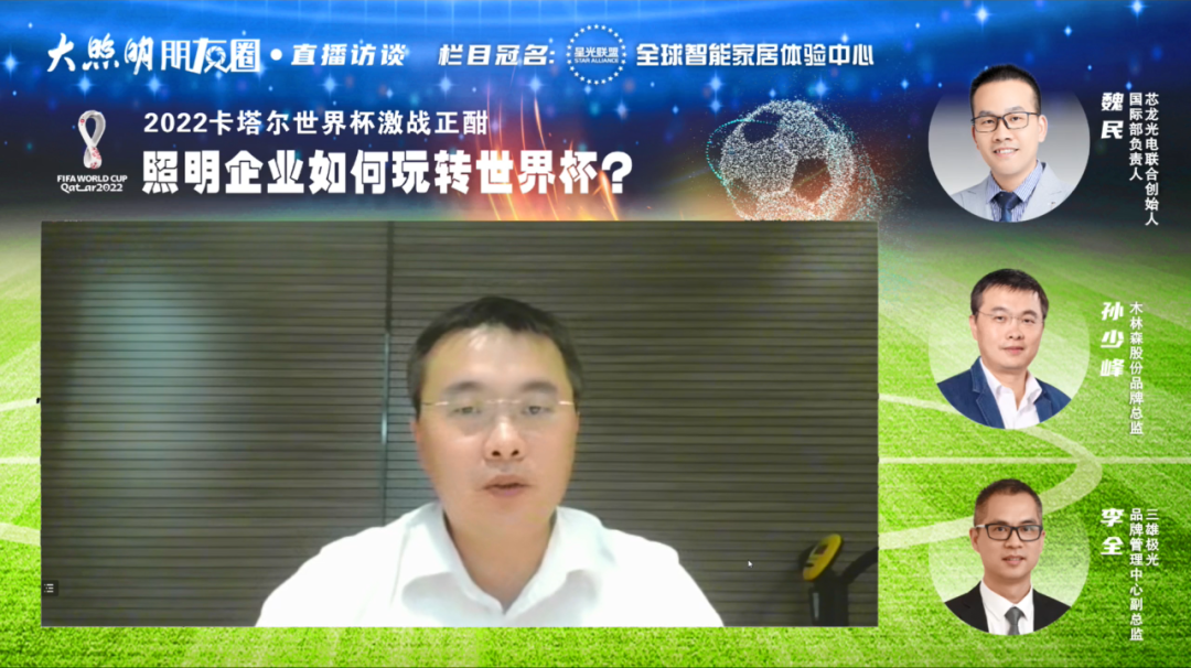 当天下午,芯龙光电联合创始人、国际部负责人魏民,木林森股份品牌总监孙少峰,三雄极光品牌管理中心副总监李全以线上连线的形式空降大照明直播间,大照明全平台联席总裁唐斌担纲主持,一同畅聊“照明企业如何玩转世界杯?”。