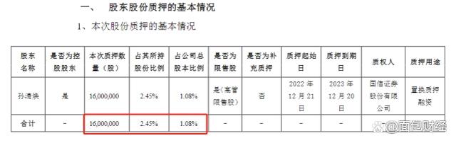 截至公告披露日,孙清焕共持有公司股份数量6.53亿股,占公司总股本的44.03%。孙清焕本次质押股份占其所持公司股份的2.45%,占公司总股本的1.08%,质押期限为2022年12月21日至2023年12月20日。