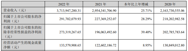 2022年,回天新材聚焦主营业务发展,加大海内外市场开拓力度,实现营业收入37.14亿元,同比增长25.71%;实现净利润2.92亿元,同比增长28.29%;实现扣非净利润2.73亿元,同比增长39.40%。