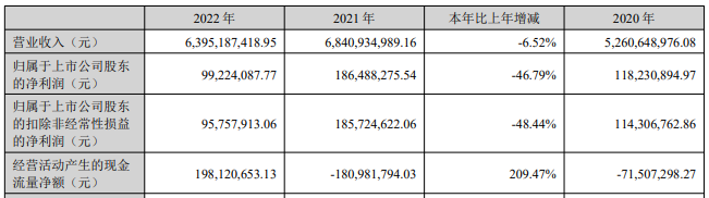 报告显示,2022年好上好实现营业收入63.95亿元,同比减少6.52%;实现净利润9922.41万元,同比减少46.79%;实现扣非净利润9575.79万元,同比减少48.44%。