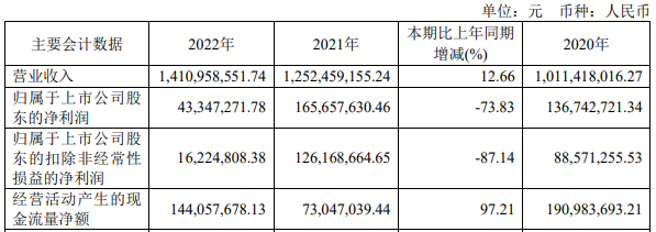 2022年,久日新材坚定不移实施发展战略,不断强化内部管理,持续开展降本增效,确保公司稳定运营。实现营业收入14.11亿元,同比上升12.66%;实现净利润4334.73万元,同比下降73.83%;实现扣非净利润1622.48万元,同比减少87.14%。