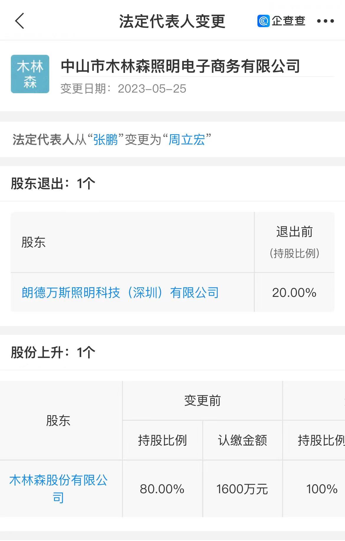 股权变更前,木林森照明电子商务的大股东为木林森,持股80%;朗德万斯照明持股20%。股权变更后,其由木林森100%持股。