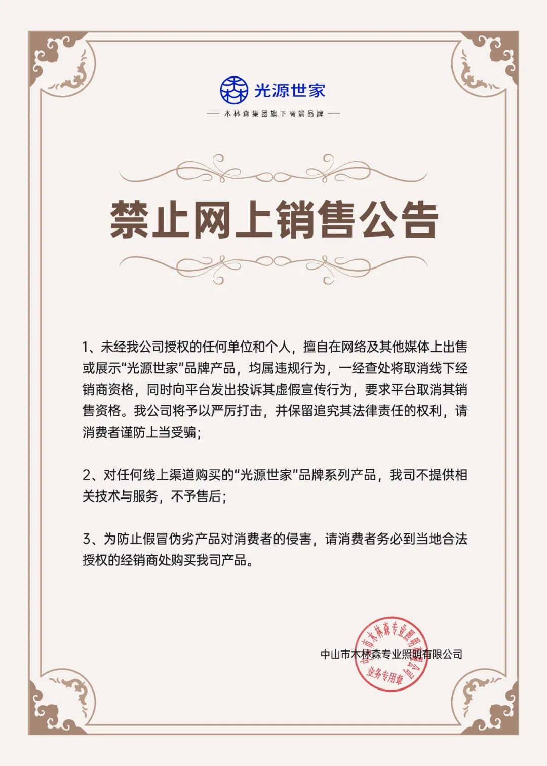 今年6月,木林森集团旗下品牌光源世家也发布了一则《禁止网上销售公告》指出,未经我公司授权的任何单位和个人,擅自在网络及其他媒体上出售或展示"光源世家"品牌产品,均属违规行为,一经查处将取消线下经销商资格,同时向平台发出投诉其虚假宣传行为,要求平台取消其销售资格。