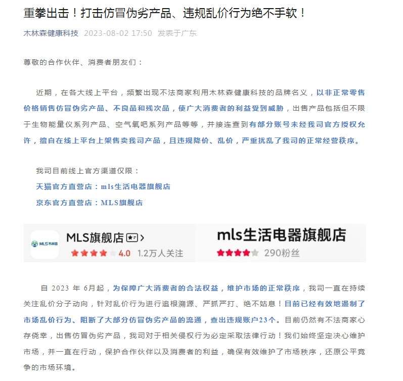 8月2日,木林森股份(股票代码002745)旗下控股子公司木林森健康科技发布推文称,近期,在各大线上平台,频繁出现不法商家利用木林森健康科技的品牌名义,以非正常零售价格销售仿冒伪劣产品、不良品和残次品,并接连查到有部分账号未经我司官方授权允许,擅自在线上平台上架售卖我司产品,且违规降价、乱价,严重扰乱了我司的正常经营秩序。