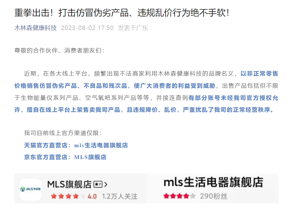 近日,照明头部企业木林森旗下控股子公司木林森健康科技发布推文称,近期,在各大线上平台,频繁出现不法商家利用木林森健康科技的品牌名义,以非正常零售价格销售仿冒伪劣产品、不良品和残次品,并接连查到有部分账号未经我司官方授权允许,擅自在线上平台上架售卖我司产品,且违规降价、乱价,严重扰乱了我司的正常经营秩序。
