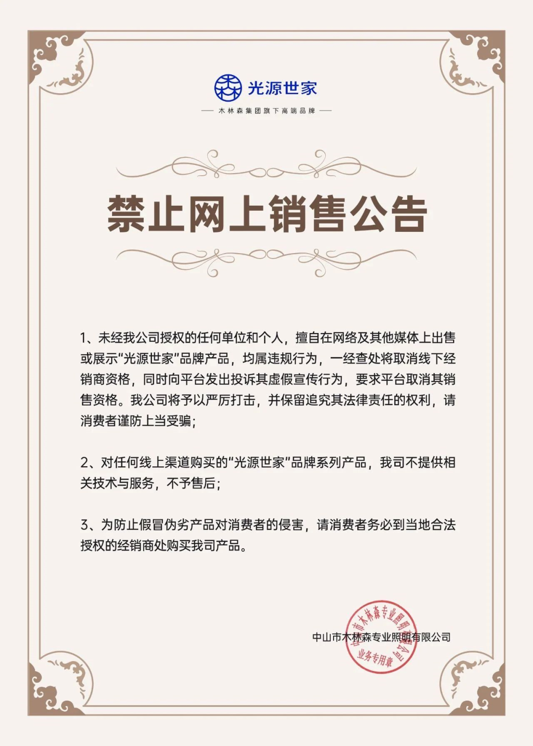 早在今年6月,木林森集团旗下品牌光源世家也发布了一则《禁止网上销售公告》,其中指出,未经我公司授权的任何单位和个人擅自在网络及其他媒体上出售或展示“光源世家”品牌产品,均属违规行为。