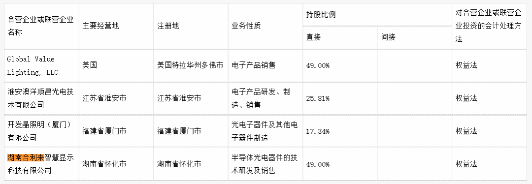 值得注意的是,合利来智慧显示是木林森持股49%的联营企业,主要业务是半导体光电器件的研发及销售。而中来光电的经营范围除了半导体照明器件、半导体分立器件、光电子器件、电子元器件专用设备、显示器件、照明器具等的制造与销售之外,还涉及集成电路集成电路芯片级产品。