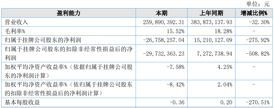 而穗晶光电2023年业绩表现也不佳。根据昨日披露的2023年报显示,穗晶光电去年实现营收约2.6亿元,同比下降32.3%;归属于挂牌公司股东的净利润由盈转亏。由于营收下降,其毛利率相较去年同期也有所下滑。