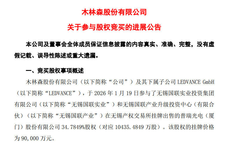 同日,木林森还公告称,公司及其下属子公司 LEDVANCE 于1 月19日参与了无锡国联实业和无锡国联产业在无锡产权交易所挂牌出售的普瑞光电(厦门)股份有限公司 34.7849%股权(对应10435.4849万股)。该股权的挂牌价格为 90,000 万元。本次交易完成后,公司及下属子公司LEDVANCE将持有普瑞光电67.894%股权。