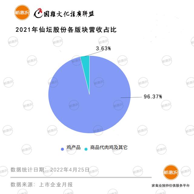 仙坛股份作为国内知名的白羽肉鸡企业,主营业务涵盖父母代肉种鸡养殖、雏鸡孵化、饲料生产、商品代肉鸡养殖与屠宰、鸡肉产品加工、销售。主要产品是商品代肉鸡与鸡肉产品,二者营收分别占总营收的3.64%和96.36%。其中鸡肉产品主要以分割冻鸡肉产品、冰鲜鸡肉产品和预制菜的形式销售,商品代肉鸡主要为公司自用。