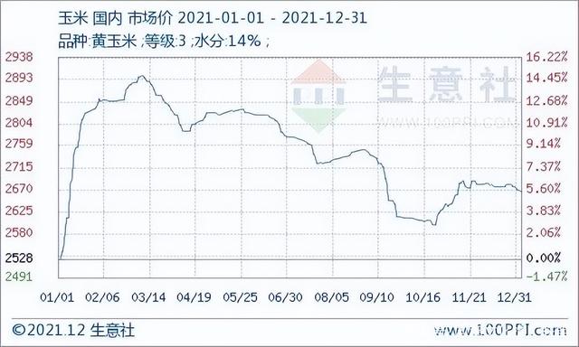 纵观全年国内玉米价格走势,2021年国内玉米价格整体延续2020年涨势继续冲高至周期内高点后震荡回落,四季度小幅回升后整体震荡前行,比较往年玉米价格,2021年国内玉米价格全年均处于较高水平波动前行,1月1日3等黄玉米均价为2528.57元/吨,12月31日均价为2667.14元/吨,年内上涨5.48%。
