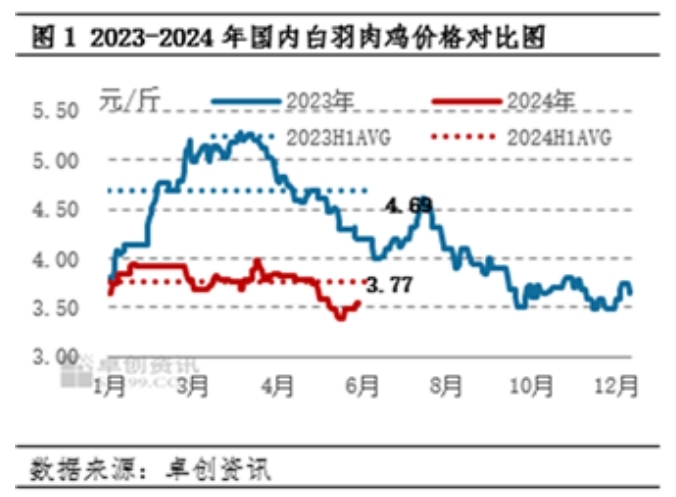 据卓创资讯数据统计,从相对水平来看,2024年上半年国内白羽肉鸡均价3.77元/斤,较去年上半年下滑0.92元/斤,跌幅19.62%。从长周期运行趋势来看,上半年价格整体处于近年中低位水平。