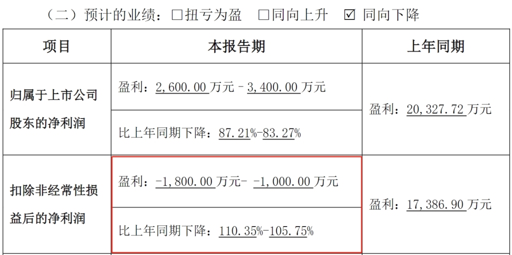 预计2024年上半年实现净利润2600万元–3400万元,同比下降87.21%-83.27%;预计扣非净利润亏损1800万元-1000万元,同比下降110.35%-105.75%。
