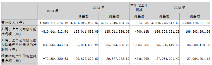 2024年,公司实现营业收入40.09亿元,同比下降13.83%;归属于上市公司股东的净利润为-8.10亿元,上年同期为1.35亿元;归属于上市公司股东的扣除非经常性损益的净利润为-8.36亿元,上年同期为8,500.47万元;经营活动产生的现金流量净额为-7,358.48万元,上年同期为2,987.73万元。