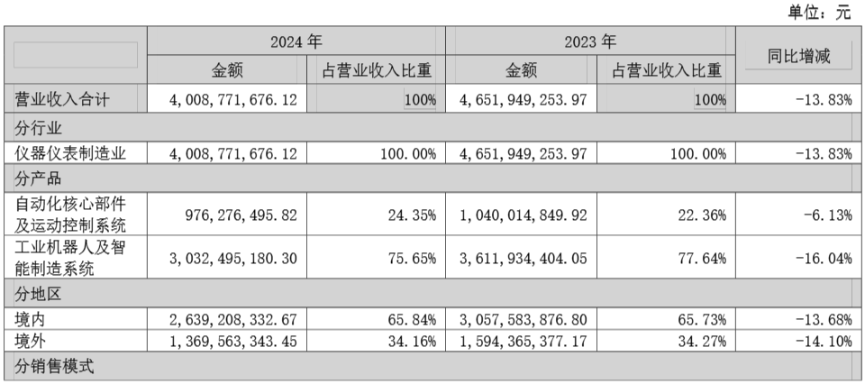 从业务板块毛利率来看,核心业务盈利能力亦呈下滑趋势。2024年工业机器人及智能制造系统毛利率为27.6%,较2022年的31.7%下降4.1个百分点;自动化核心部件及运动控制系统毛利率为33.8%,较2023年的35.0%下降1.2个百分点。2025年一季度毛利率进一步下滑至28.3%,同比下降4.4个百分点,行业竞争加剧与成本控制难题凸显。