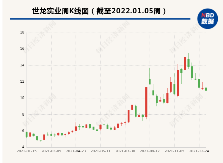 截至2021年12月31日收盘,世龙实业报收于11.25元,较2020年末的6.23元上涨80.58%。2021年2月8日,世龙实业盘中最低价报4.70元,股价触及全年最低点,11月24日股价最高见16.35元,最高点相较于年初最大涨幅达到162.44%。2021年度共计12次涨停收盘、3次跌停收盘。
