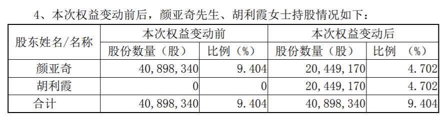根据颜亚奇与胡利霞签订的离婚协议,颜亚奇拟将其持有的公司2044.92万股股份,约占公司总股份的4.702%,分割至胡利霞名下。权益变动后,颜亚奇和胡利霞各持有公司2044.92万股股份,各约占公司总股本4.702%。此次权益变动不会导致公司控股股东、实控人发生变化,不涉及公司控制权变更。按照国光股份9月15日收盘价10.98元/股计算,胡利霞分到股份的市值约为2.25亿元。