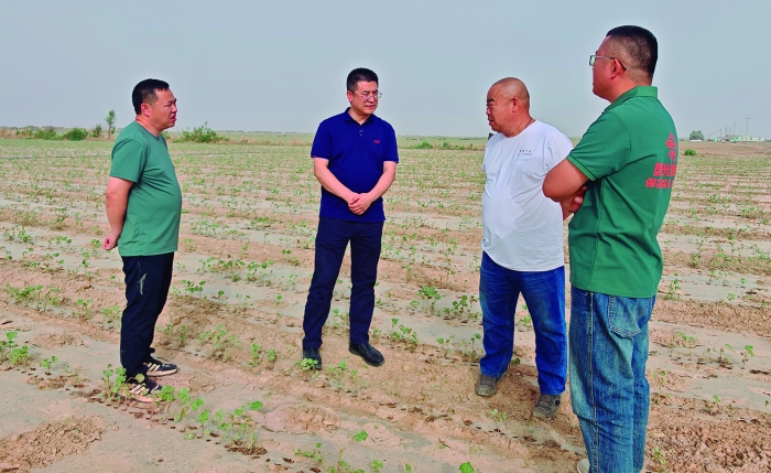 | | 国光股份 董事长何颉(左二)在新疆调研公司产品在棉花上的应用情况 |