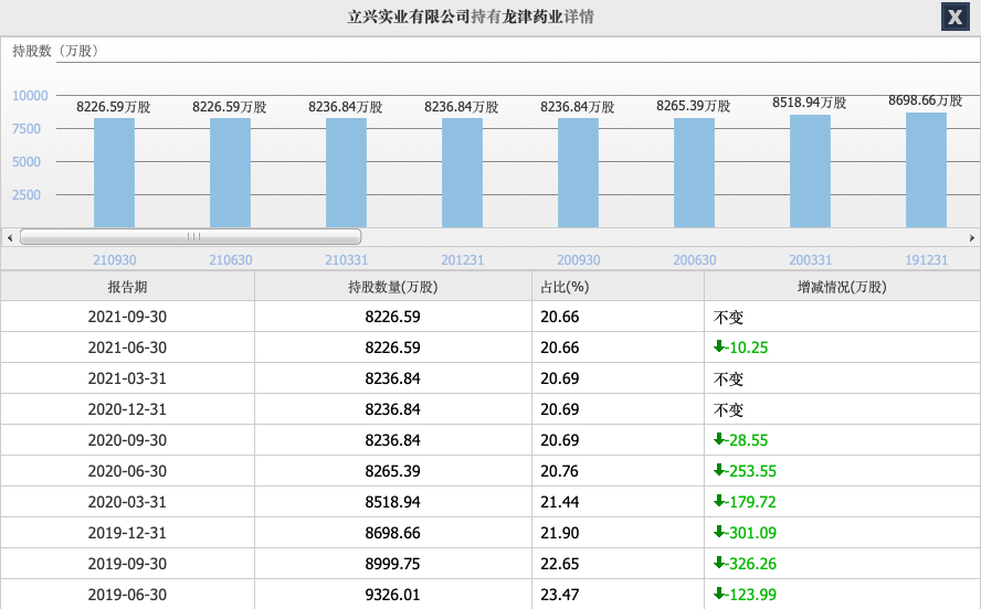 上述工作人员还透露:“这已经是二股东立兴实业实施的第四个减持周期了。”《证券日报》记者梳理了立兴实业持有股份的变动,从2019年起,立兴实业就在逐步减持龙津药业股份,从持股23.79%降至2021年11月的20.12%,减持计划一直在实施。