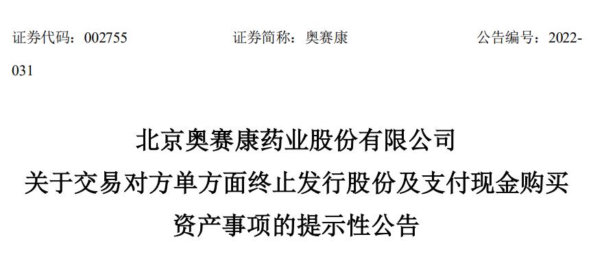4月17日晚间,奥赛康(002755)发布公告称,公司原拟收购江苏唯德康医疗科技有限公司(以下简称“唯德康”)60%的股权,近日,公司接到交易对方的通知,其单方面要求终止本次交易的相关协议。