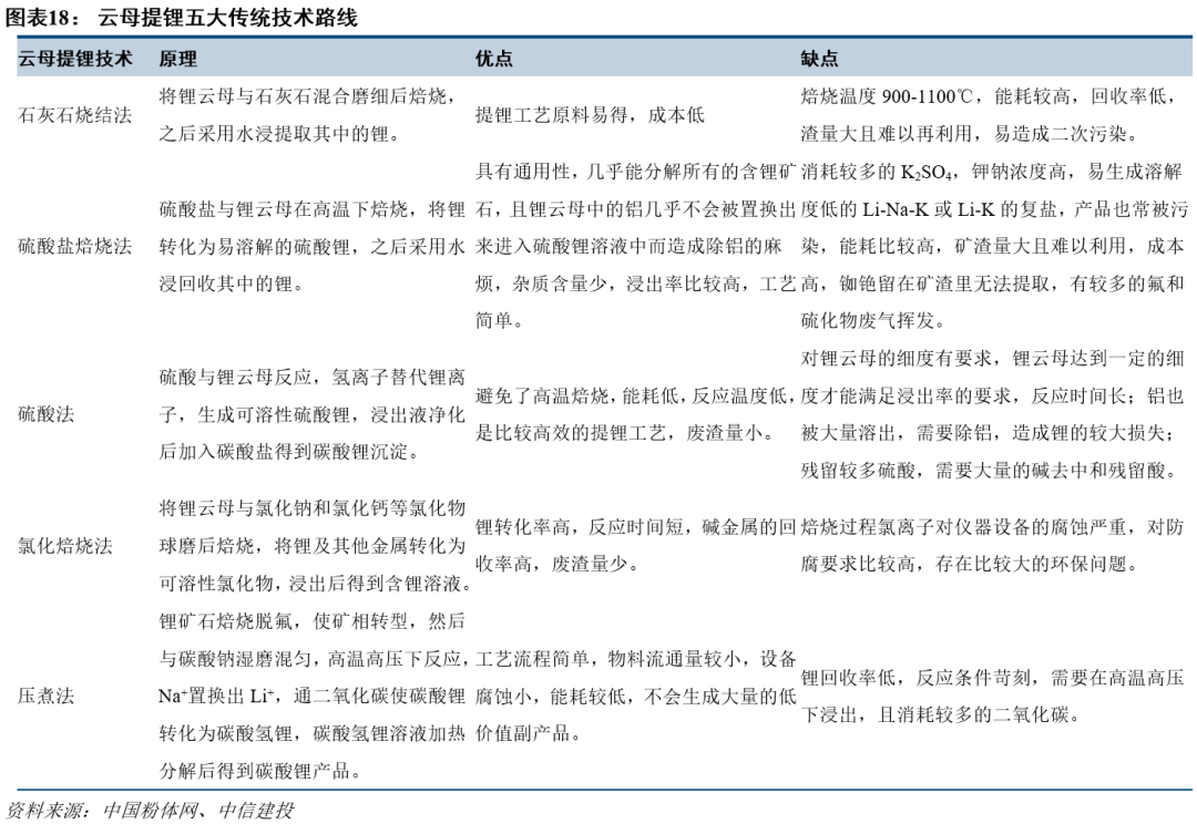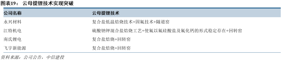 2019年之前云母提锂一度不被看好。虽然国内锂云母资源十分丰富,但此前云母提锂并未得到充分的推广,主要是面临技术、成本两方面的难题。首先,锂云母成分复杂,主要组成有锂钾硅铝氟,在原料提炼和锂盐提纯上难度更大,尤其是氟生产过程中会腐蚀设备,生产无法连续,这也是早期以锂云母为原料的碳酸锂成本高且品质不佳(主要以工业级为主)的核心原因;其次,锂云母精矿品位低,Li2O含量通常为2.0-3.5%,生产1吨碳酸锂需要约18-19吨锂云母精矿(品位3.0%计算),是用锂辉石精矿耗量的2.4倍,而且会产生大量的冶炼渣难以处理。因此,云母提锂在相当一段时间内几乎无人问津。