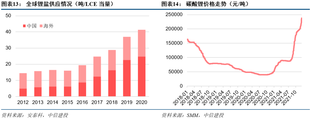 锂价将高位运行,行业高景气将持续数年时间。锂价在2020年年中跌破4万元/吨后确立底部,随后价格反弹,2021年一季度翻番达到8万元/吨,三季度突破10万元/吨,四季度再次上冲,达到20万元/吨,12月下旬达到24万元/吨。价格暴涨背后的原因,是下游需求火爆、供应难以满足。由于未来两年时间内锂供应紧张难以得到缓解,尤其是2022年上半年,几无增量但预计需求依然火爆,因此断定锂供应最紧张的时刻可能仍未到来,锂价有望冲击新高;2023年锂供应会有较为显著的增长,但需求进入S曲线陡峭增长期,预计供应依然保持较为紧张的局面,锂盐价格有望在高位运行,行业高景气度至少维持数年时间。