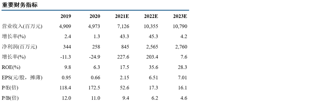 盈利预测和投资建议:结合赛道景气度及公司优势,我们2021-2023年公司营业收入分别达到71.3/103.6/107.9亿元,归母净利润分别为8.5/25.7/27.6亿元,对应EPS分别为2.15/ 6.51/7.01元,对应当前股价PE为52.6/17.3/16.1倍,首次覆盖,给予“买入”评级。